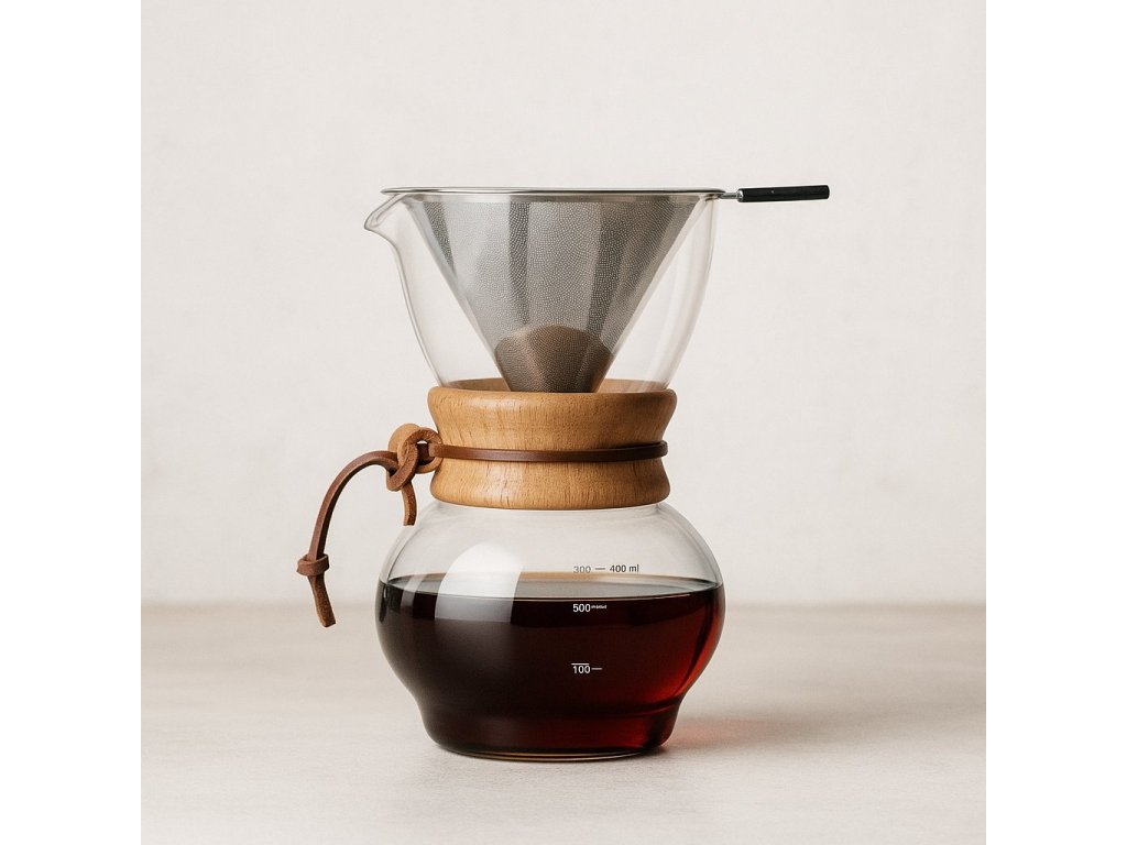 Překapávač ze skla s elegantním dřevěným úchytem je ideální volbou pro přípravu filtrované kávy metodou pour-over. Minimalistický design nejen skvěle vypadá, ale i dokonale slouží – sklo odolává vysokým teplotám a nedeformuje chuť nápoje. Dřevěný límec zajišťuje bezpečné uchopení bez popálení. Použití s papírovým filtrem umožňuje extrahovat jemné chutě z aroma kávy. Skvělý doplněk pro stylové domácí baristy.
